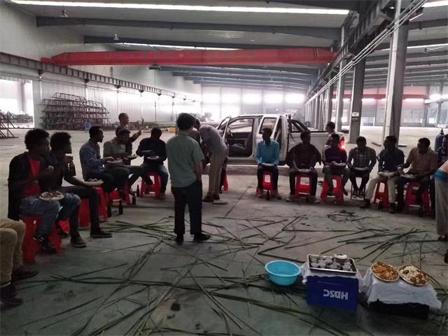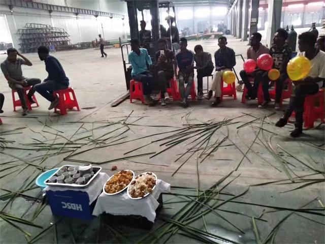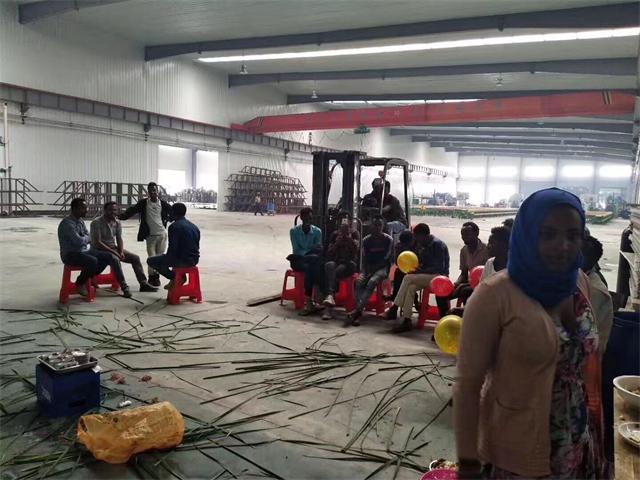 下面圖中是埃塞俄比亞員工舉行慶祝儀式,看大家個個喜逐顏開,手里拿著五顏六色的氣球,還有中間的那些美味的佳肴,想必是這次安裝過程一定非常完美,我公司員工和埃塞俄比亞客戶相處融洽??创蠹以?/span>開心的吃著飯,和我公司員工進行著交談,就像是一家人一樣,沒有種族、國家的隔閡。還有遠在海外的廠房,依舊在我們的共同努力下井井有條,由此可以看出來我國員工并沒有因為身在異鄉(xiāng)而產(chǎn)生消極怠工的態(tài)度,反而更加顯現(xiàn)出來他們那無比的敬業(yè)精神,廠房中那有條不紊的鋁型材擠壓機生產(chǎn)線,以及廠房的合理利用、安排,都是由我公司專業(yè)人員安排設(shè)計,讓廠房達到最大的利用率。
